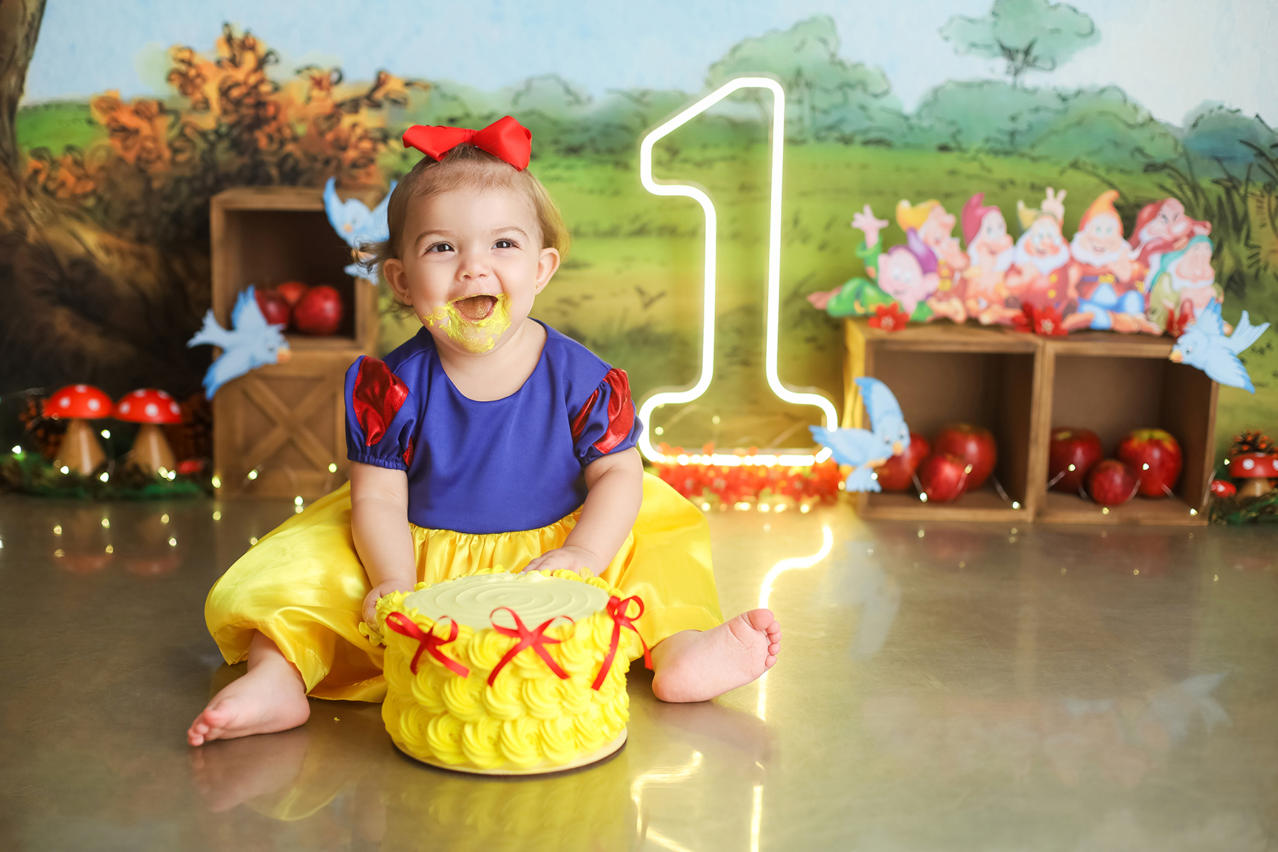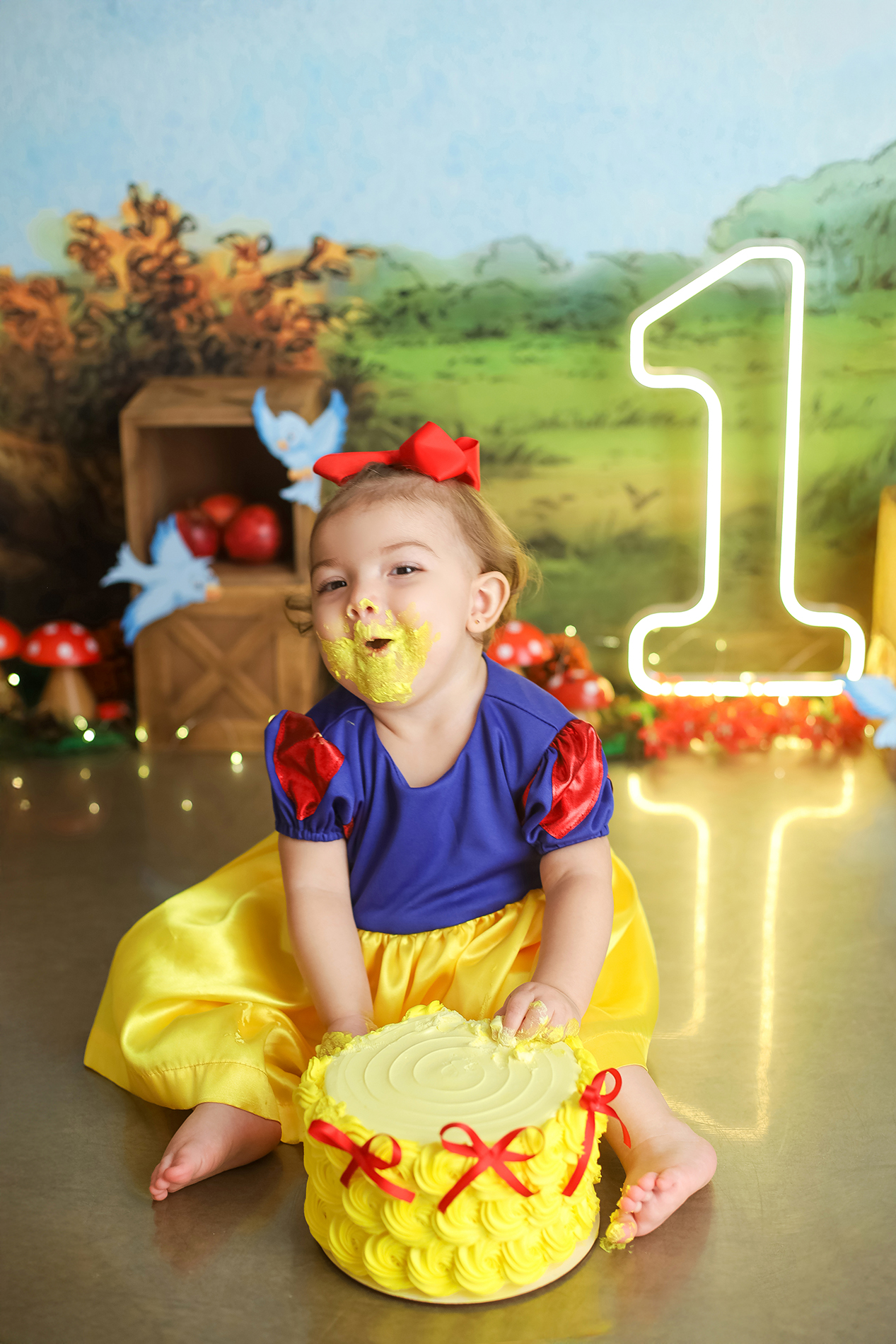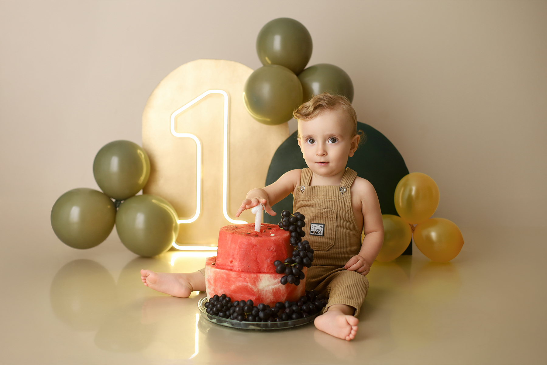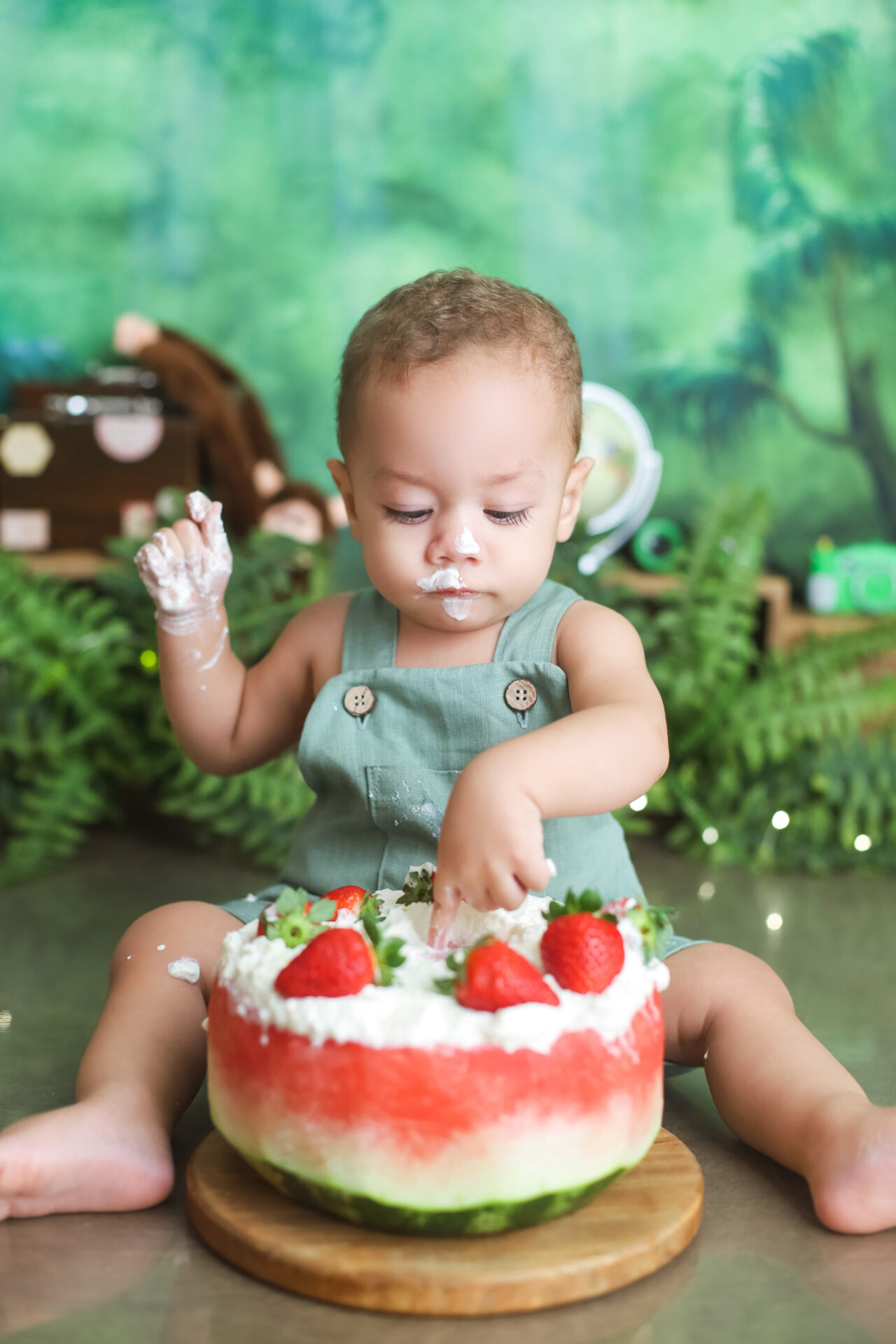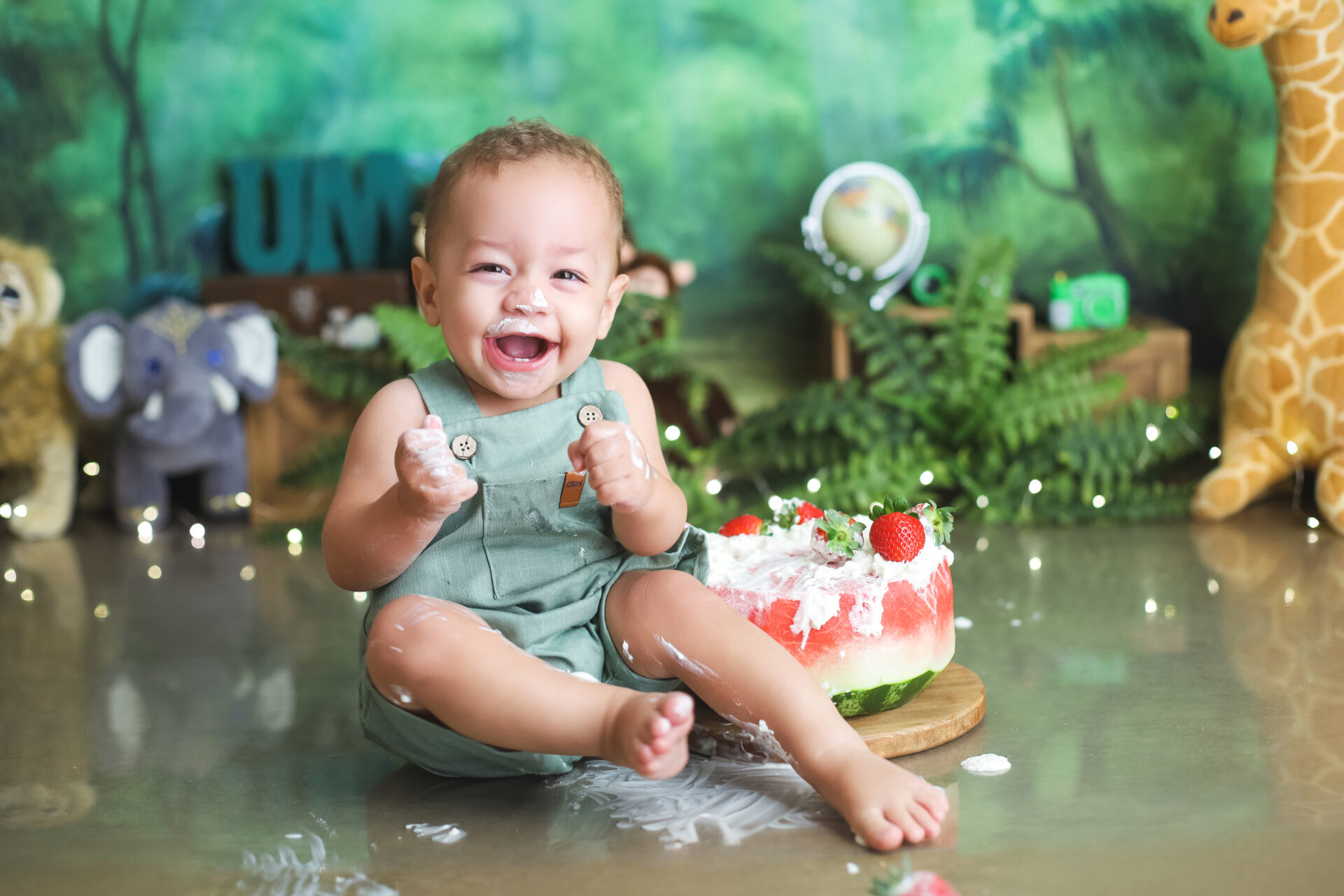 Sobre as fotos com o bolo: É opcional. A mamãe pode optar por fazer as fotos no cenário de um aninho sem o bolo. Convenhamos que as fotos com o bolo são fofas demais! Algumas mamães não querem que o bebê coma docê nessa idade, essas mamães podem substituir o bolo clássico de chantili por um “bolo de frutas”.