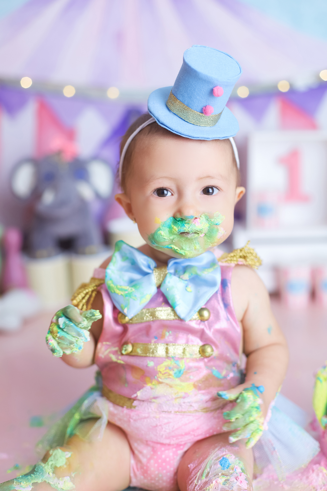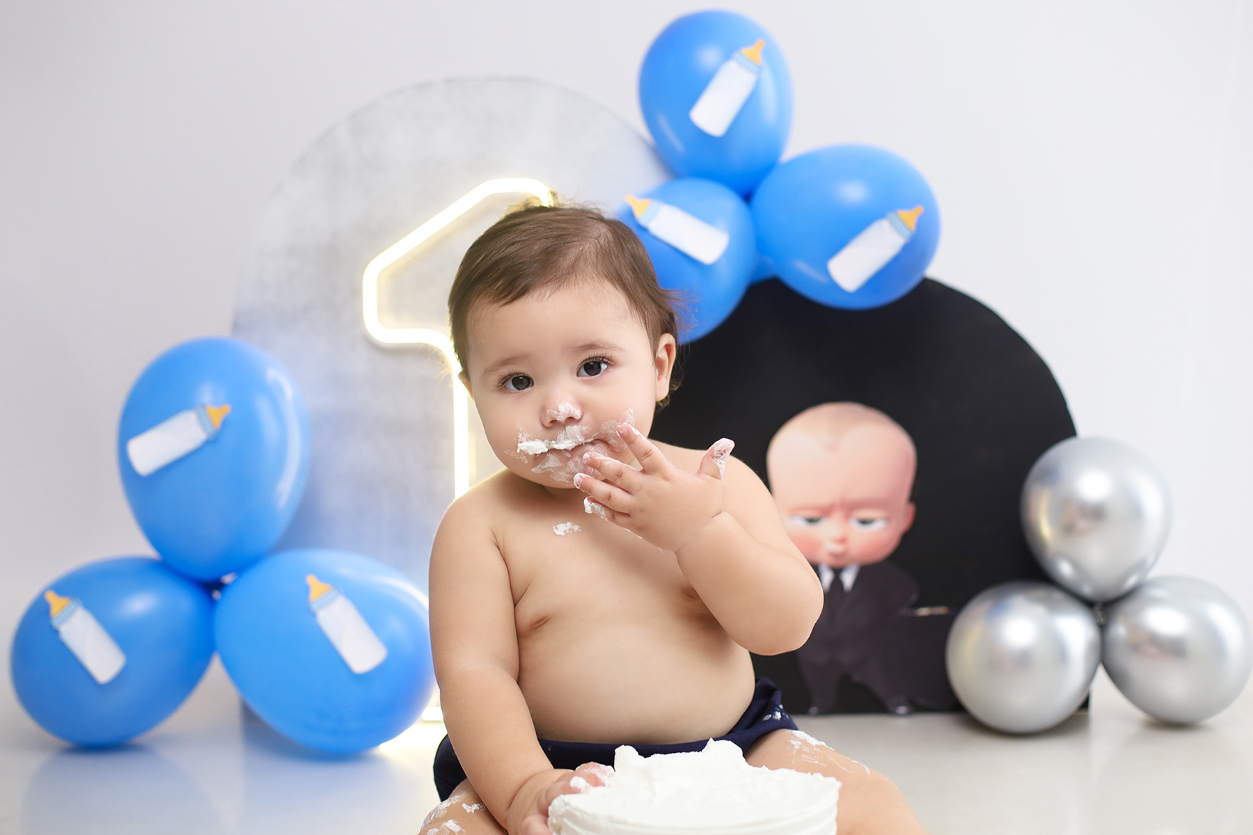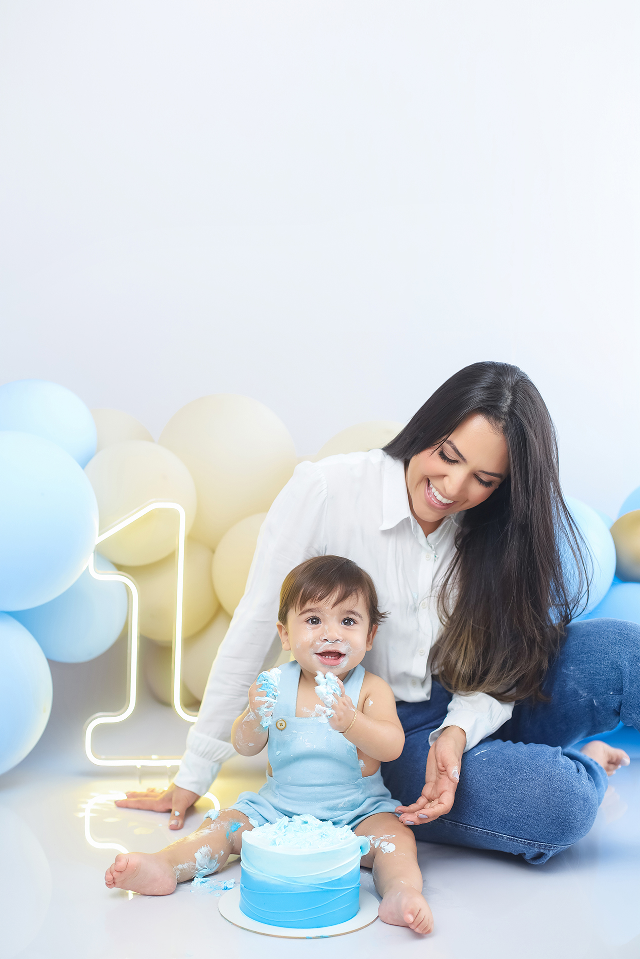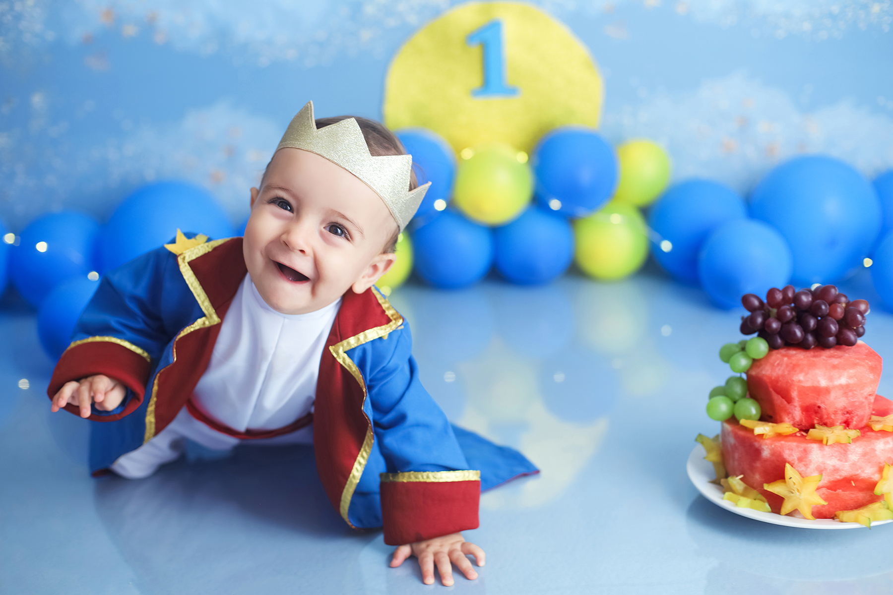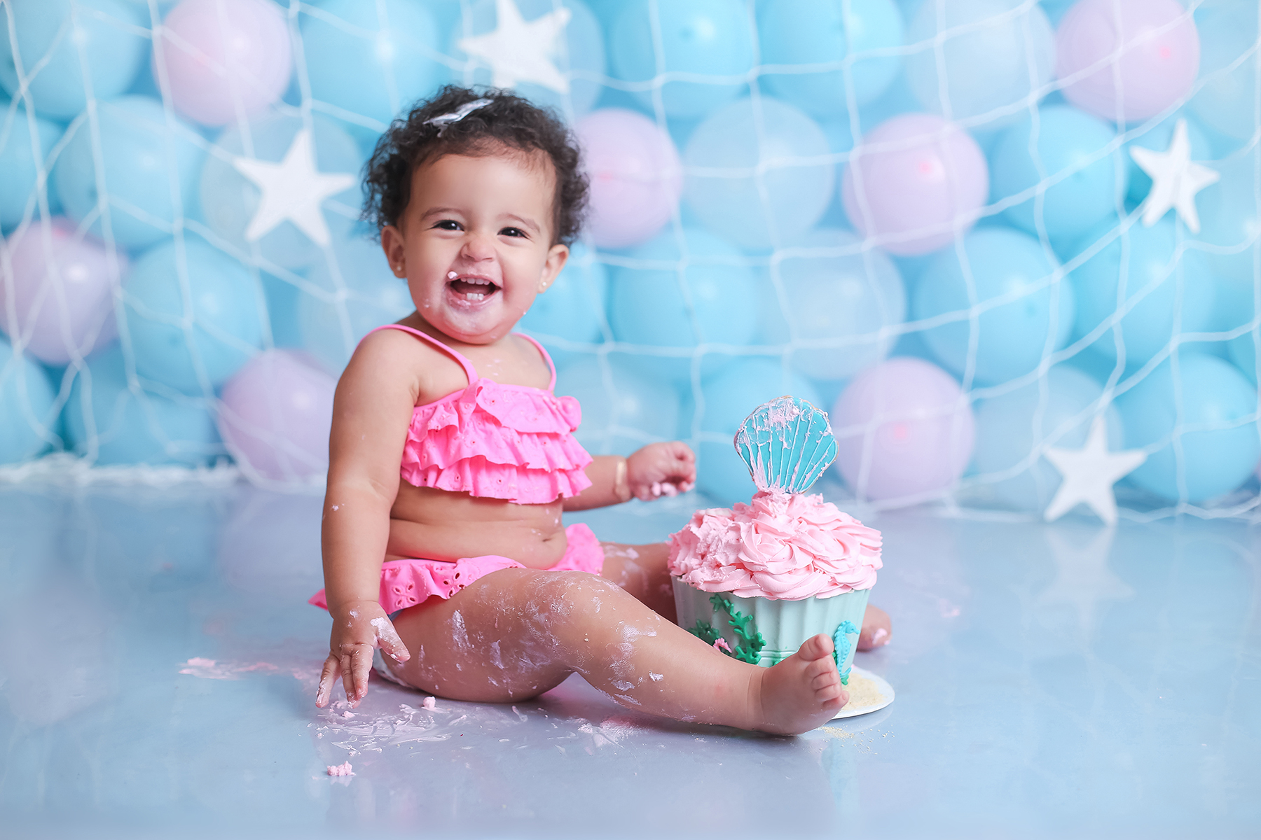 Sobre as fotos com o bolo: É opcional. A mamãe pode optar por fazer as fotos no cenário de um aninho sem o bolo. Convenhamos que as fotos com o bolo são fofas demais! Algumas mamães não querem que o bebê coma docê nessa idade, essas mamães podem substituir o bolo clássico de chantili por um “bolo de frutas”.