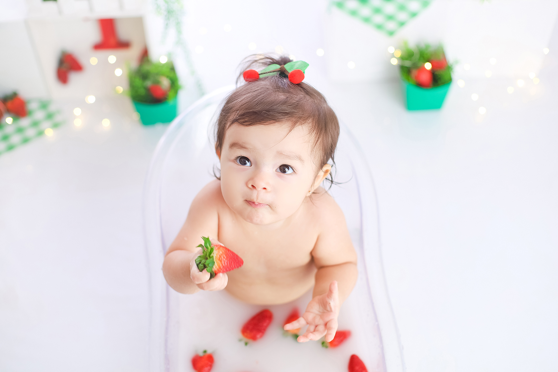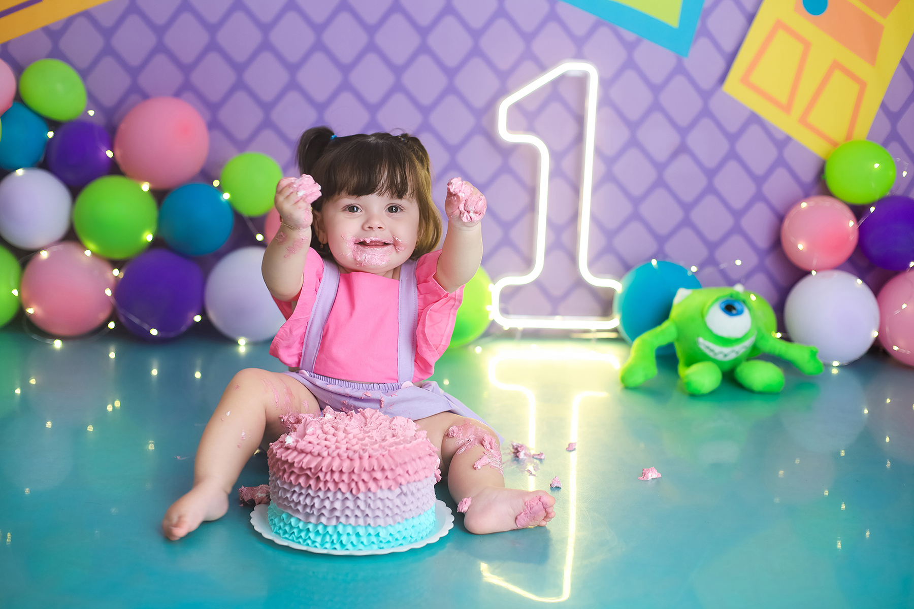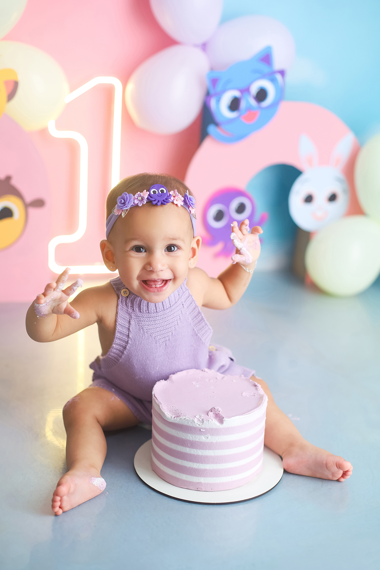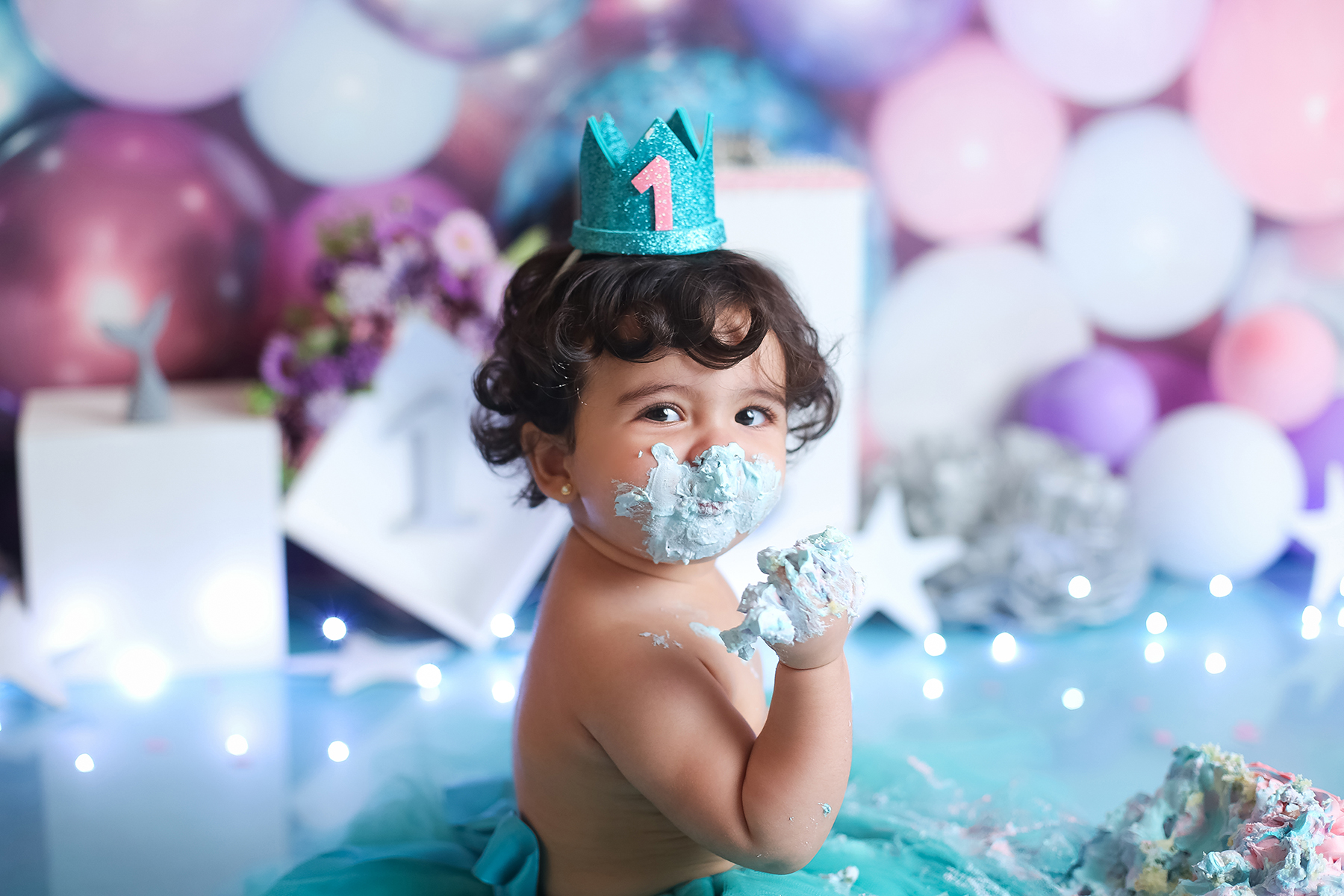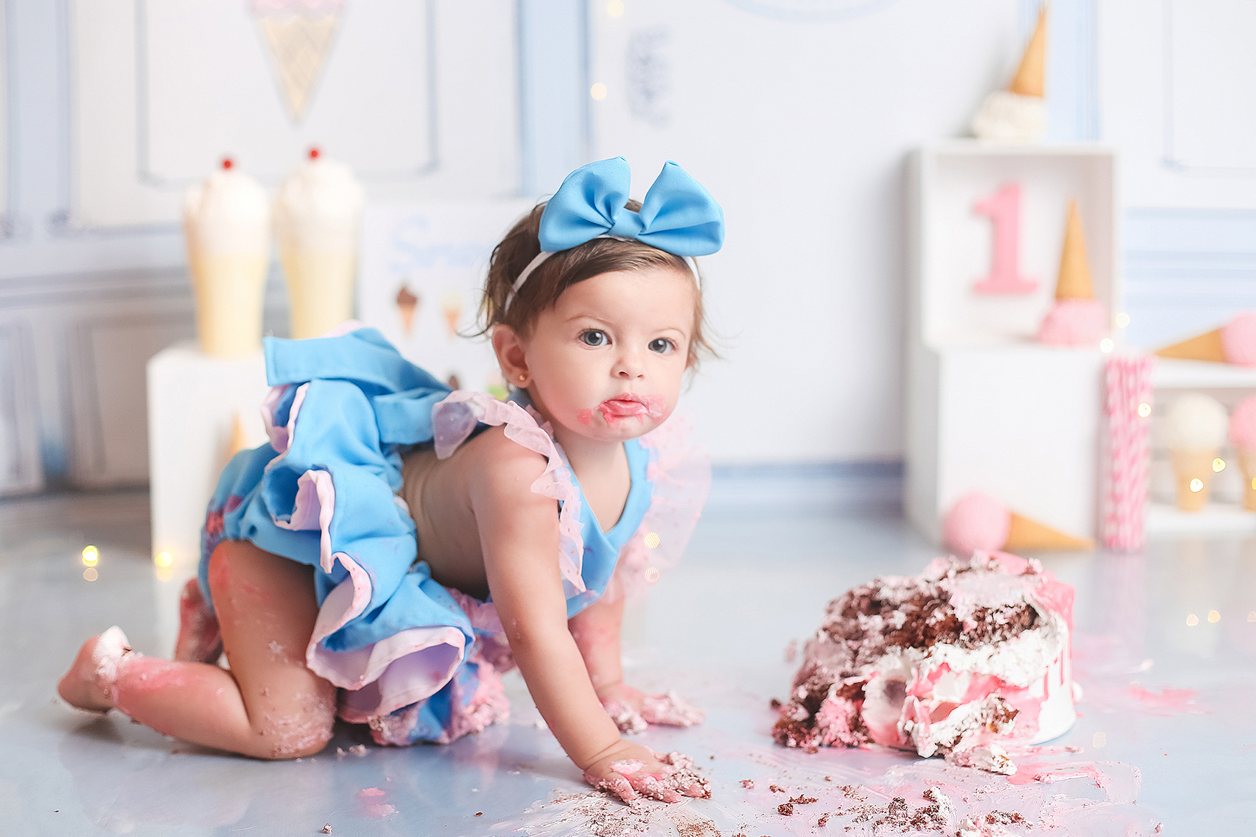 Sobre as fotos com o bolo: É opcional. A mamãe pode optar por fazer as fotos no cenário de um aninho sem o bolo. Convenhamos que as fotos com o bolo são fofas demais! Algumas mamães não querem que o bebê coma docê nessa idade, essas mamães podem substituir o bolo clássico de chantili por um “bolo de frutas”.